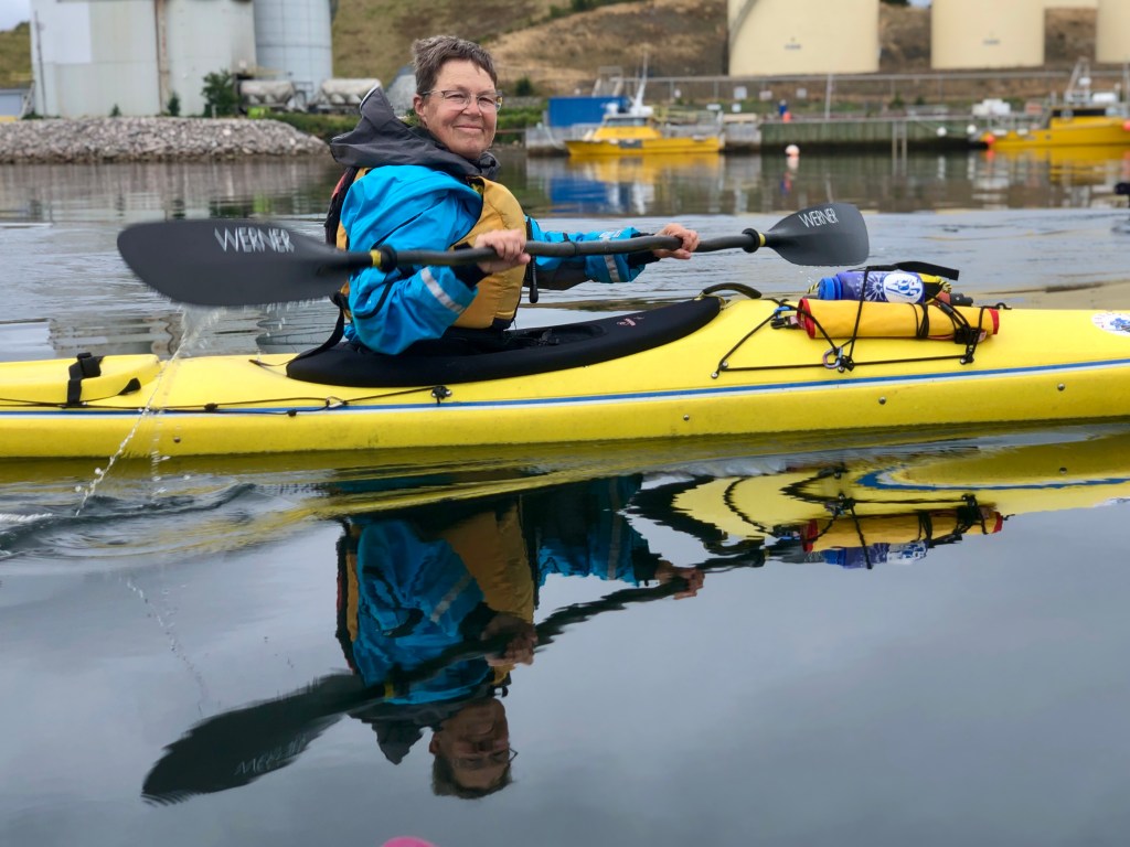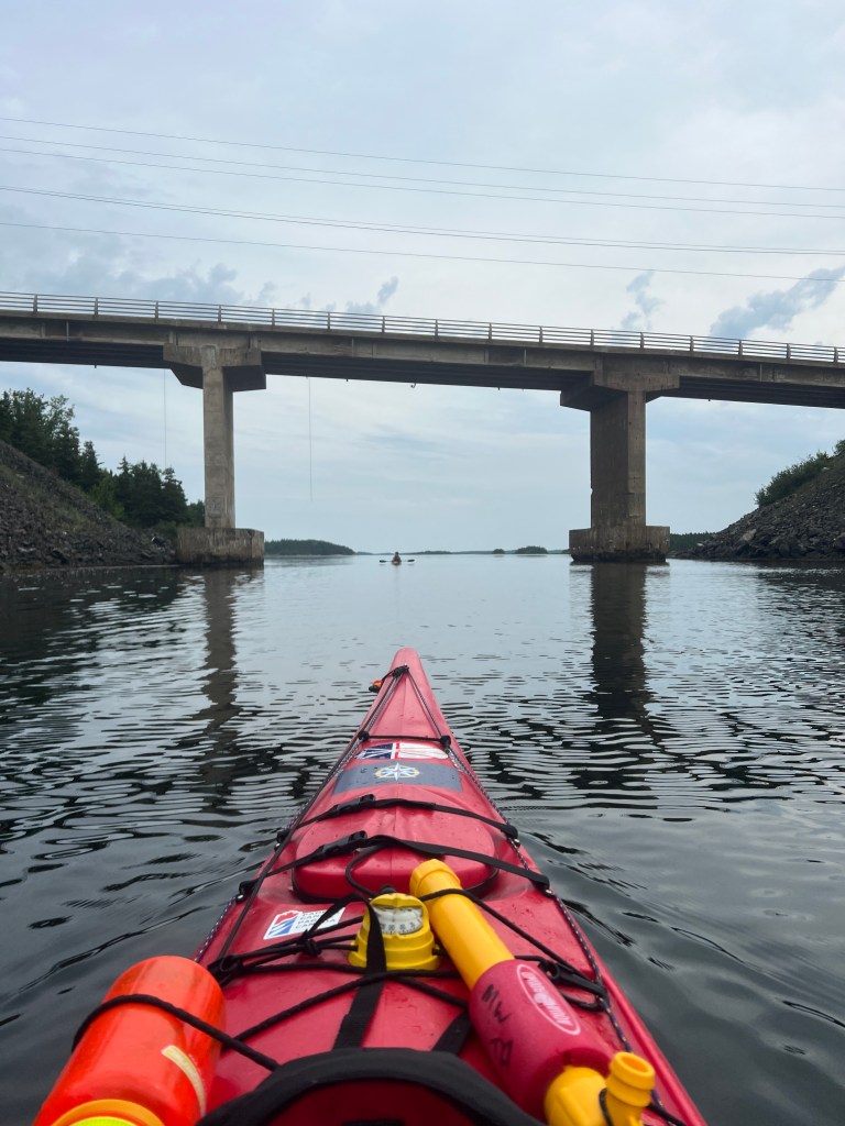 We were pretty nervous when we started out–we knew we had a big challenge in front of us–but we also knew we’d take it paddle stroke by paddle stroke, landmark by landmark, day by day. The goal for day one was to reach Moreton’s Harbour-approximately 13.5 kilometres away. Deb and Wilma saw us off and then captured us paddling under the bridge and out the tickle.