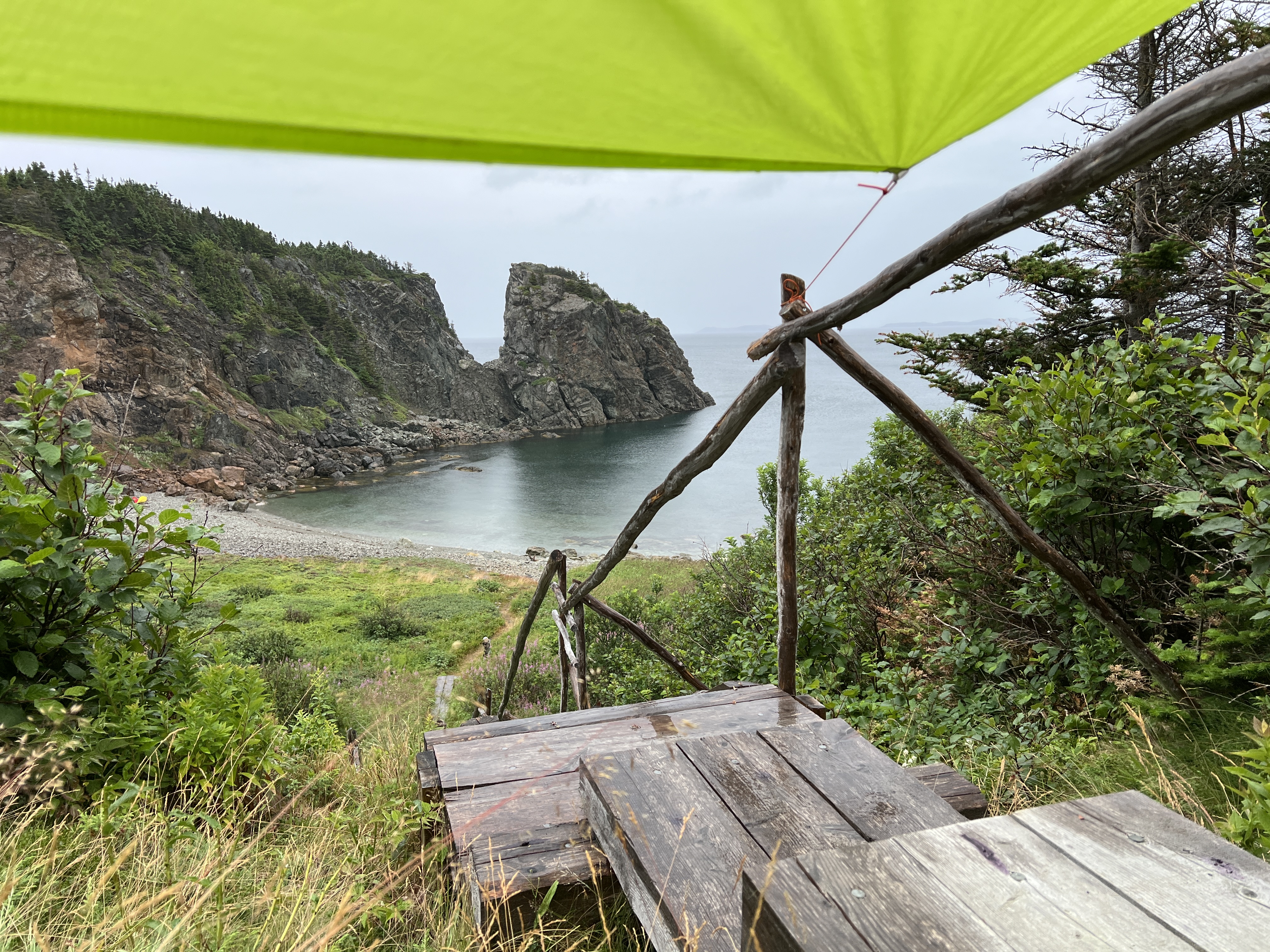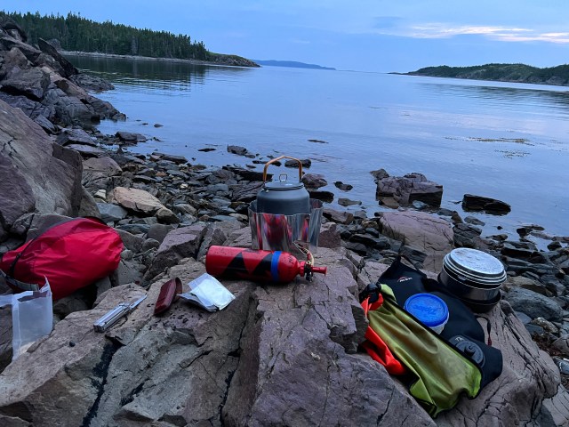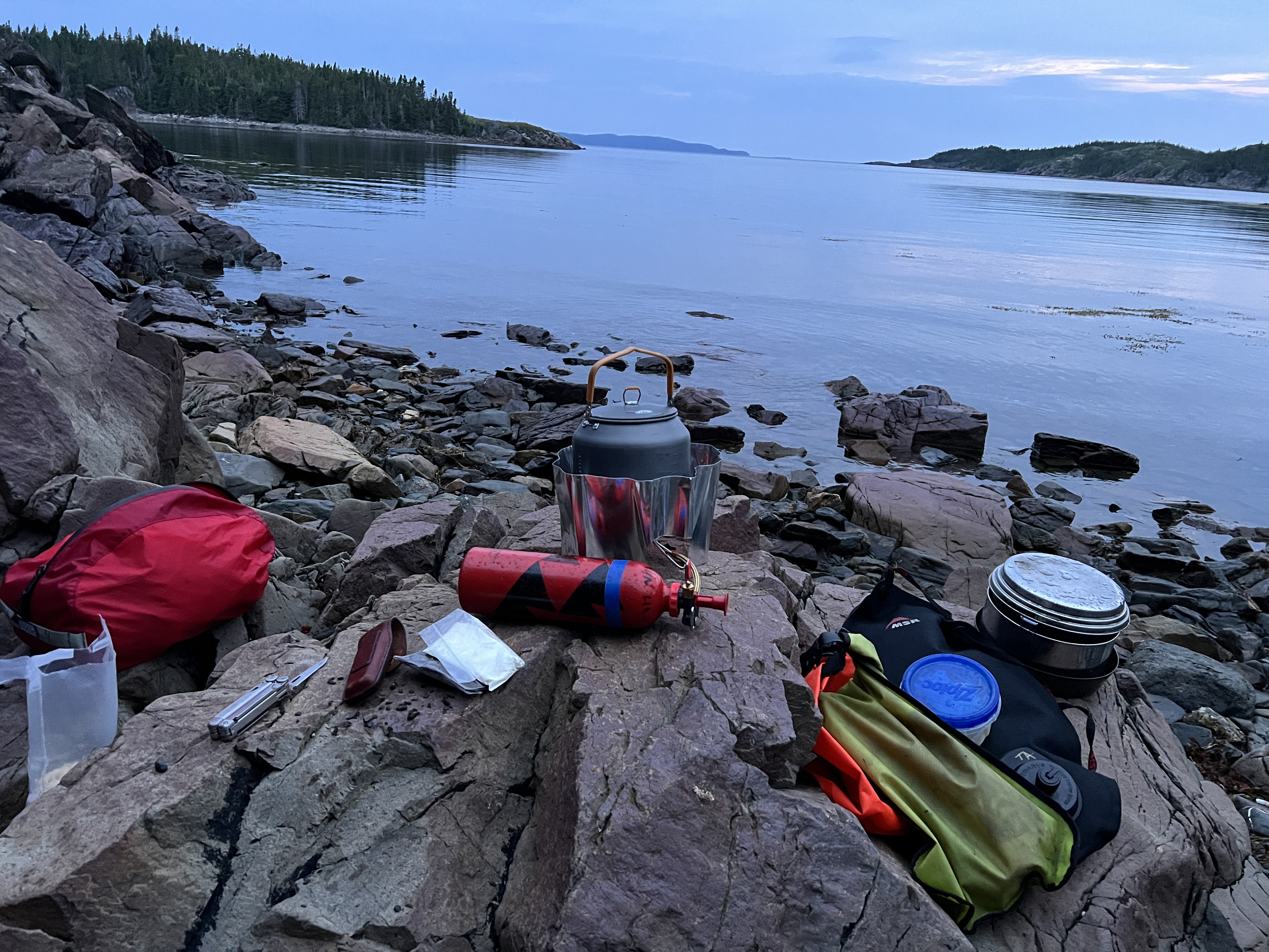 Hey, this is TA calling in from Labrador 2024 Rigolet to Cartwright. I’m sitting here in the tent with Marion, and we’re getting ourselves organized. There’s a light pitter patter, pitter patter, pitter patter of rain on the tent. We’ve all just crawled in after supper. We had butter chicken and salad and rice. We’ve had a fabulous first day, a challenging first day.