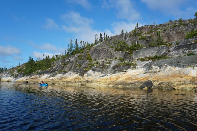 We enjoyed a tailwind on Day 11 as we made our way further and further out the bay. The terrain continued to dazzle our senses. We passed several cabins and stopped for lunch beside one, perched on a rock. A few hours later, we filled our water bags from a stream and started to look for a campsite. The shores sported cliffs with only minute beaches. We paddled on and then spotted a small island that held potential. We paddled over to the smooth rocky lump and jumped out of our boats.