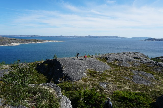 We spent Day 13 (Tuesday) hiking to the tops of the nearby hills, both to enjoy the views and to beat the heat. We were lucky to hit the only sunny days that Hopedale had seen all summer. Our windy perch proved excellent, and we spent much of the day looking out to the Labrador Sea for the ferry that should have been coming into Hopedale that day on its Northern swing to Nain. Mark texted Linda to get the ferry schedule, and she replied with, “The ferry sails south on 9:00 am Thursday, you must go to Hopedale tomorrow. Don’t miss the ferry!” We had a confirmed booking for 5:00 pm Thursday sailing, but the schedule had changed to leaving eight hours early with no notification. With this new information as well as an updated weather forecast, we updated our plan for paddling to Hopedale and catching the ferry.