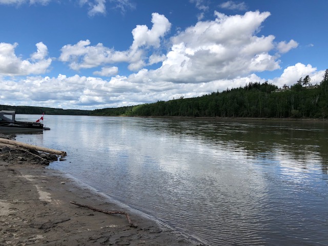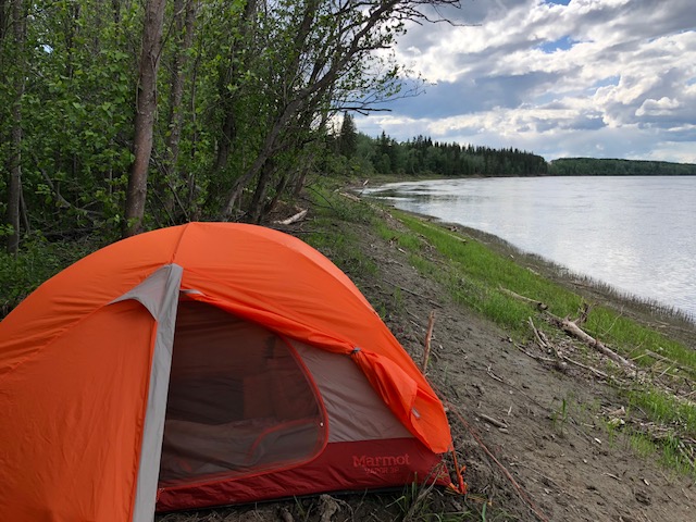 We are hunkered down in our tent. The winds are sailing round and the shaking tent is making our prayer flags sway. We are across the way from Fort Chipewyan, a wee bit broken hearted, after a huge paddling day trying to get there. We are 4 kilometres shy and camped on the winter road. The sky above us has tumbled some and is a sickening shade of gray but so far, no big strikes. It will be fine with us, the swirling winds have already cemented our decision but it was still hard to stop so close. The risk benefit analysis had too much on the potential loss side if a doozy storm kicked up. So, we are dry, have our best campsite in days (no sand, no bugs, no mud, and cell coverage) :-).