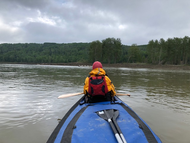 We are hunkered down in our tent. The winds are sailing round and the shaking tent is making our prayer flags sway. We are across the way from Fort Chipewyan, a wee bit broken hearted, after a huge paddling day trying to get there. We are 4 kilometres shy and camped on the winter road. The sky above us has tumbled some and is a sickening shade of gray but so far, no big strikes. It will be fine with us, the swirling winds have already cemented our decision but it was still hard to stop so close. The risk benefit analysis had too much on the potential loss side if a doozy storm kicked up. So, we are dry, have our best campsite in days (no sand, no bugs, no mud, and cell coverage) :-).